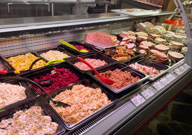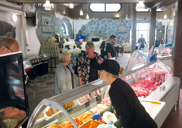Lounasta ja tuoreet juuri leikatut lihat samalla kertaa. Tiskistä myös suoraan saunasta leppäsavun lämmöstä tuodut Suomen parhaat palvilihat.