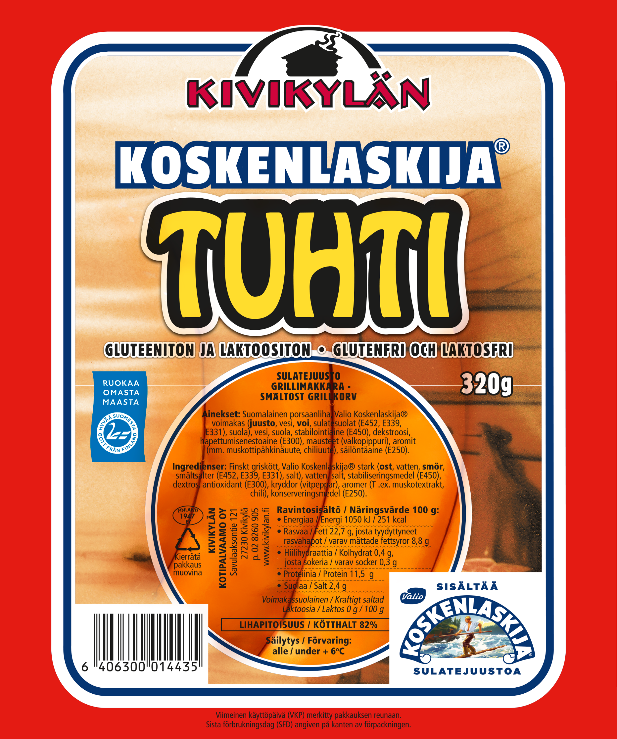 Suomalainen porsaanliha, Valio Koskenlaskija® voimakas (juusto, vesi, voi, sulatesuolat (E452, E339, E331), suola), vesi, suola, stabilointiaine (E450), dekstroosi (maissi), hapettumisenestoaine (E300), mausteet (valkopippuri), aromit (muskotinkukka, muskottipähkinäuute, kardemumma, chiliuute), säilöntäaine (E250).