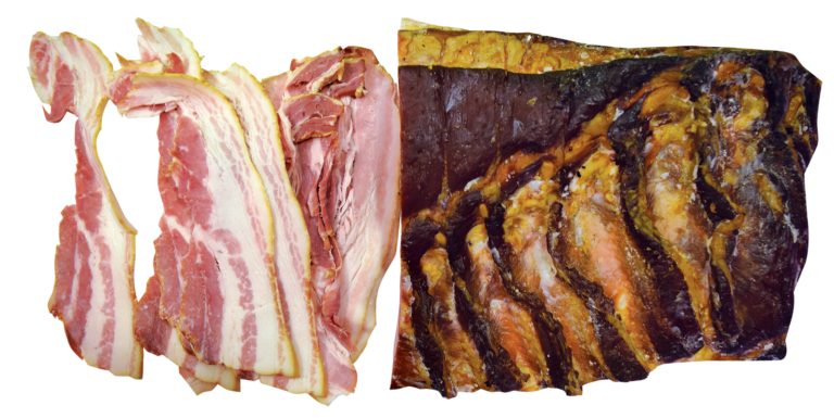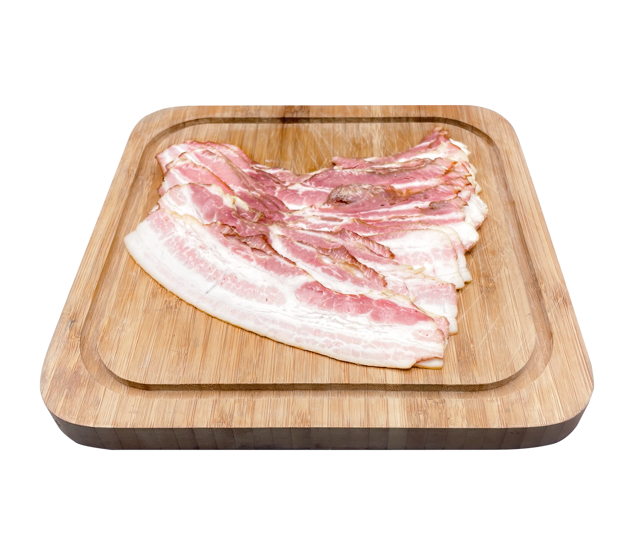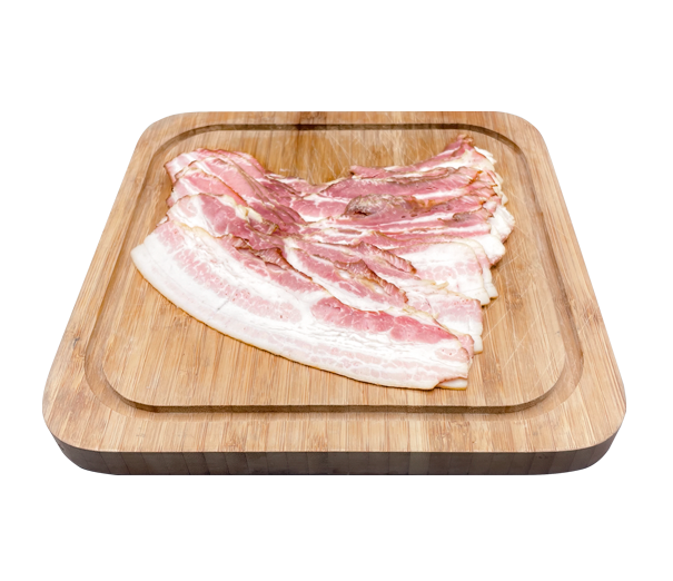 Valikoitua porsaankylkeä, miedosti suolattu ja savustettu. Ohueksi pekonisiivuksi leikattua.